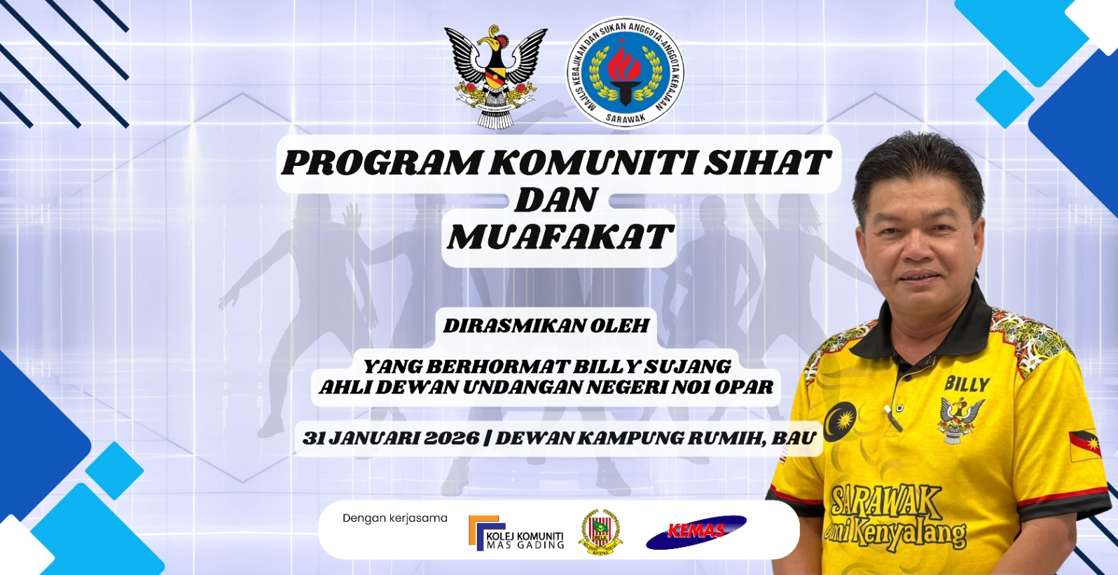 Pada 31 Januari 2026, Program Komuniti Sihat dan Muafakat telah berjaya dianjurkan di Perkarangan Tabika Kemas, Kampung rumih, Bau dengan penglibatan aktif komuniti setempat dan turut dihadiri oleh Yang Berhormat Billy Sujang Ahli Dewan Undangan N.1 Opar, Pegawai Daerah Bau, Tuan Eddy Anak Nayoi, serta wakil-wakil agensi kerajaan dan pelajar Kolej Komuniti Mas Gading (KKMG).